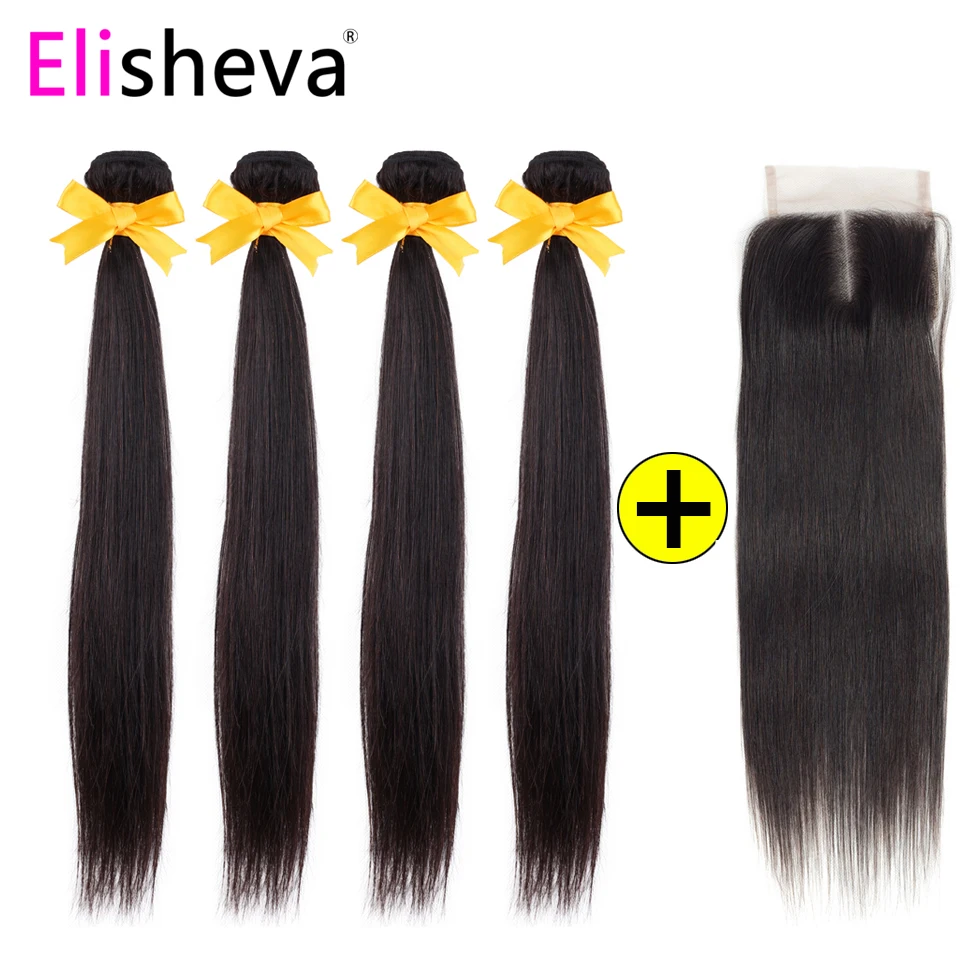 Cheap Chance for Elisheva 4 Bundles With Closure 100% Brazillian Human Hair Straight Hair Closure With Bundles Nonre