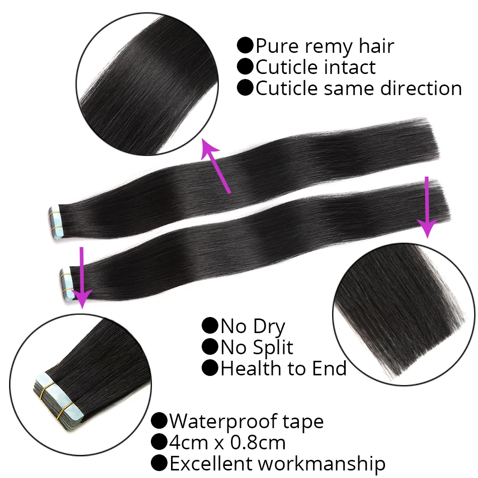 LuxyBeauty #1 Jet Black Tape In Hair Extensions Human Hair Remy Straight Double Sided Skin Weft Hair On Adhesives 14" - 22"